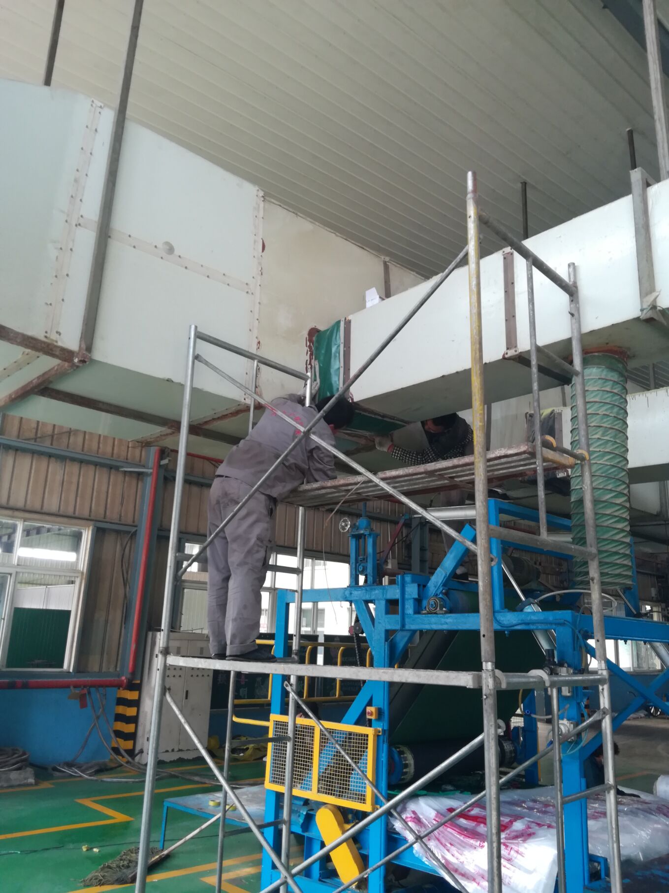 我们所采用的车间排风系统,有污染性气体或气味浓、粉尘较大的场所均可以用。这种方案跟冷风机很类似,区别是冷风机安装在承重墙或者房顶的,而机组一般比较大一些,适用于那些因无可用空间或者承重墙无法承载等而导致无法安装冷风机的,还有就是需要冷暖两用的需求的企业。这两种方案的原理是一样的,机器的工作原理也是一样的。只不过机组可控有效面积比较大一般在1台/400㎡或者更大。